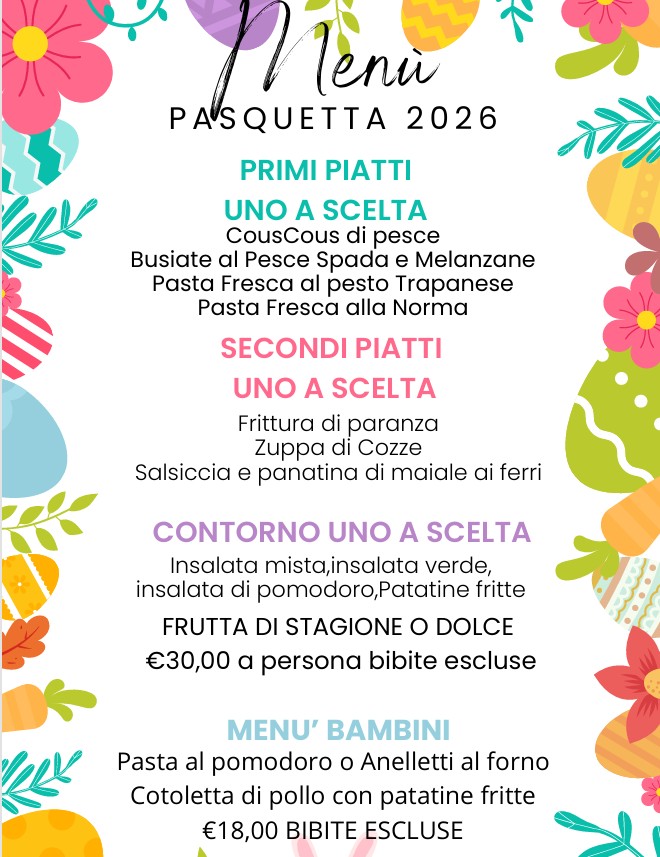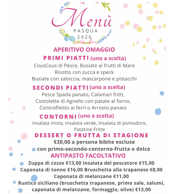 Per il Pranzo di Pasqua il menù è veramente sontuoso, dal cous cous di pesce alle busiate con frutti di mare, dal pesce spada panato alle costolette di agnello e poi ancora dessert a carrello, frutta di stagione.
